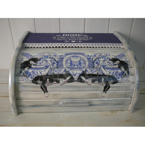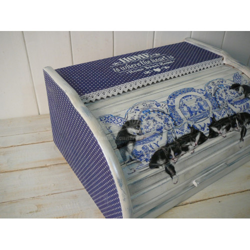 Box na pečivo a chlieb z masívneho bukového dreva - SLOVENSKÝ VÝROBOK upravený technikou decoupage a dozdobený bavlnenou čipkou a 3D nápisom. Je prelakovaný ECO lakom, takže je vhodný na bežné používanie v domácnosti.