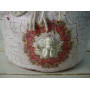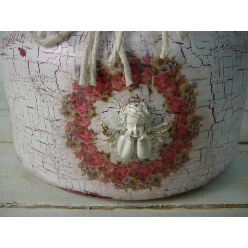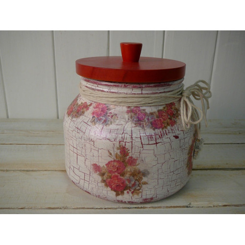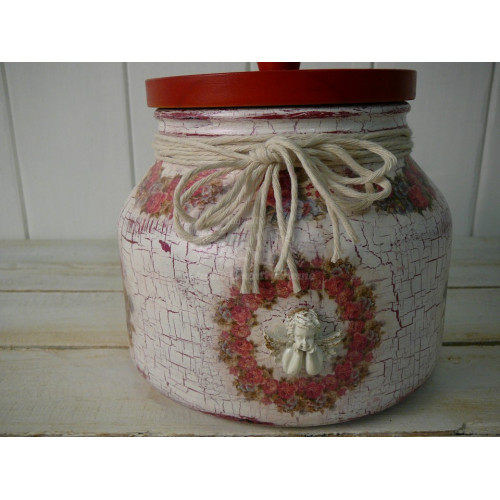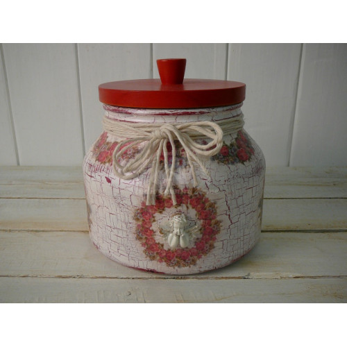 Sklenená nádoba s hrubého skla s dreveným vrchnákom upravená decoupage technikou. Vhodná je napr. na potraviny, cukrovinky a rôzne drobnosti. Je možné ju bežne používať a utierať vlhkou handričkou. Zvnútra je možné ju umyť bežným spôsobom. Je dozdobená bavlneným povrázkom, popraskaným efektom a anjelikom z polyresinu. Perleťový efekt farby.