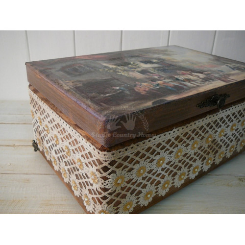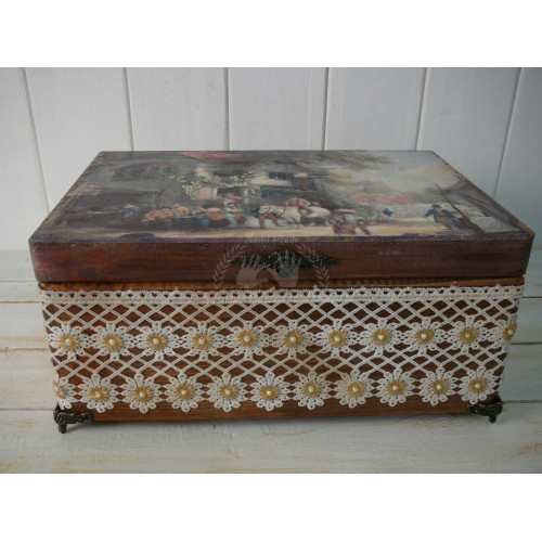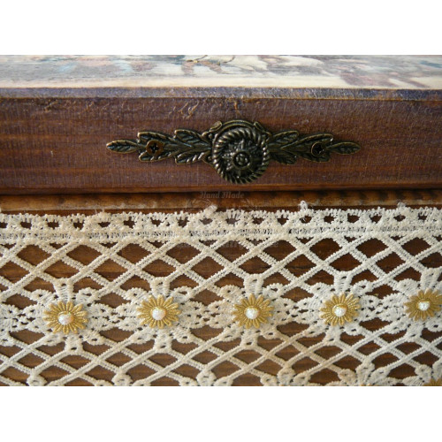 Detailne vypracovaná uzatvárateľná bednička v rustikálnom štýle napr. na fotografie, CD, kozmetiku, či iné poklady. Je zdobená technikou decoupage - 3D efekt. Dozdobená je mosadznými nožičkami a úchytkou. 3D efekt vytvára bohato zdobená celoplošná bavlnená krajka. Je to pekný kúsok na praktické použitie, alebo na dekoráciu. V ponuke sú aj iné kusy z tejto kolekcie.