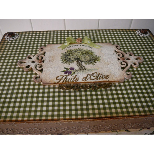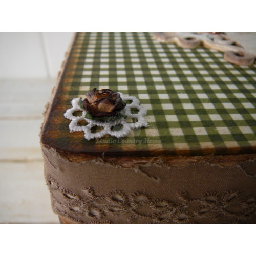 Detailne vypracovaná uzatvárateľná bednička v štýle VINTAGE napr. na recepty, či iné poklady. Je zdobená technikou decoupage a scrapbooking - 3D efekt. Dozdobená je dreveným komponentom, bavlnenou krajkou, mašličkou, mosadznou ozdobou, ružičkami a krásnou masívnou úchytkou v tvare spojených rúk. Je to veľmi pekný kúsok na praktické použitie, alebo na dekoráciu. V ponuke sú aj iné kusy z tejto kolekcie.