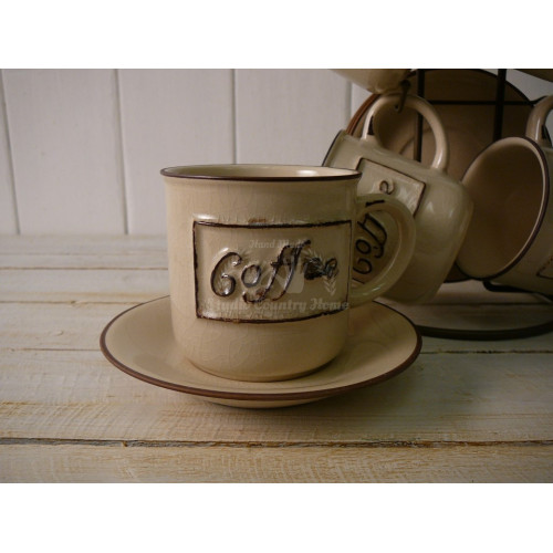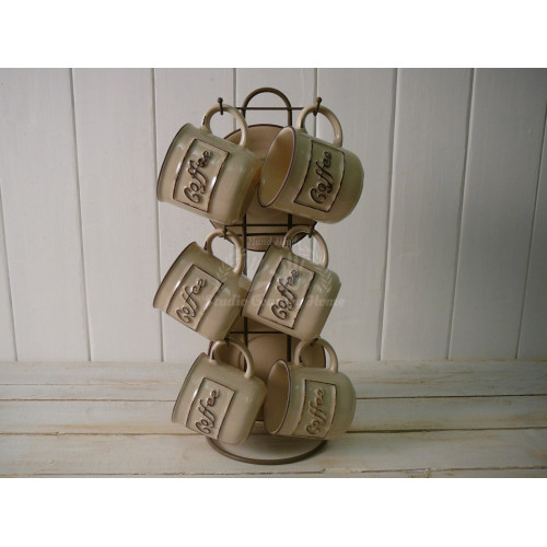 Sada porcelánových šálok na kávu pieskovo-hnedej farby s 3D nápisom zn. INART. Šálka 7x10 cm, podšálka pr. 12 cm. Sada obsahuje 6 ks šálok, 6 ks podšálok a kovový stojan.