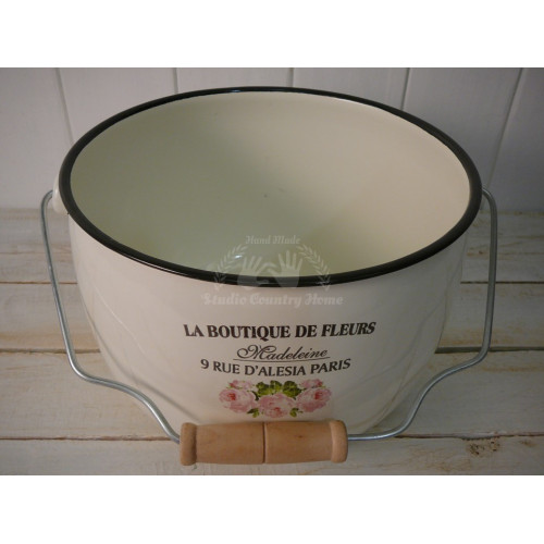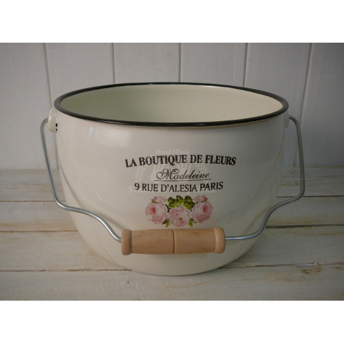 Veľká biela smaltovaná nádoba s nápisom a obrázkom ruží v štýle Provence. Na ovocie, cibuľu, zemiaky, či praktické použitie v domácnosti. Smalt je veľmi vhodným doplnkom vidieckej kuchyne, alebo kúpeľne.