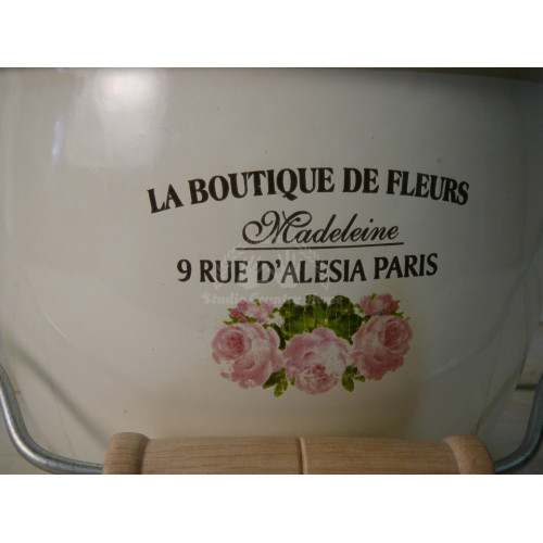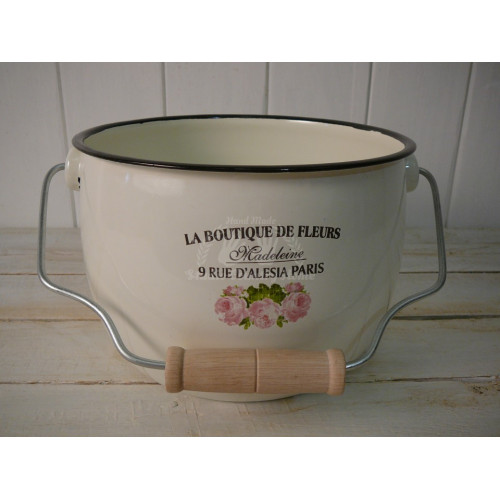 Biela smaltovaná nádoba s nápisom a obrázkom ruží v štýle Provence. Na ovocie, cibuľu, či praktické použitie v domácnosti. Smalt je veľmi vhodným doplnkom vidieckej kuchyne, alebo kúpeľne.