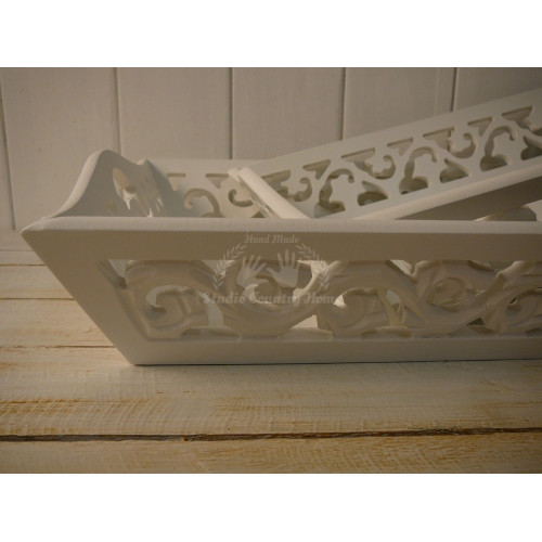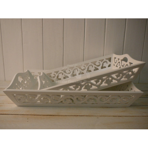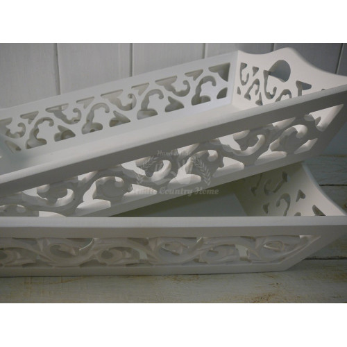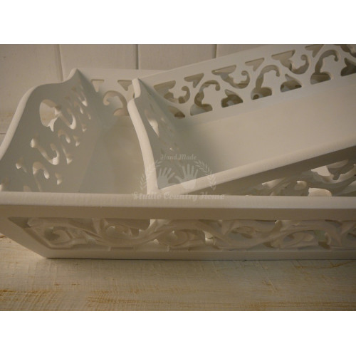 Sada dvoch krásnych vyrezávaných podnosov z MDF, veľmi pevných, bielej farby zn. MY FLAIR. Uvedený je rozmer väčšieho podnosu. Druhý podnos - menší 39x27x8 cm.
