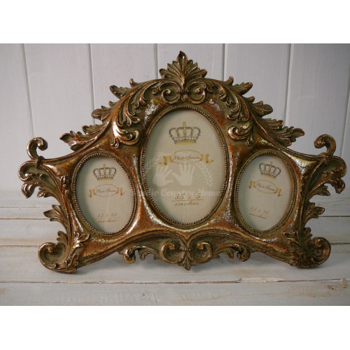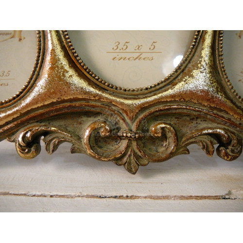 Bohato zdobený rámik na 3 fotografie zn. ORIGINALS. Je to veľmi výrazný doplnok antickej zlatej farby. Zadná časť je potiahnutá čiernym zamatom. Má praktickú nožičku na postavenie rámika. Materiál - polyresin.