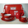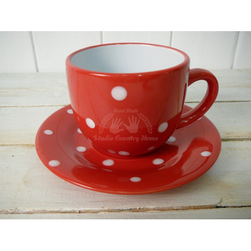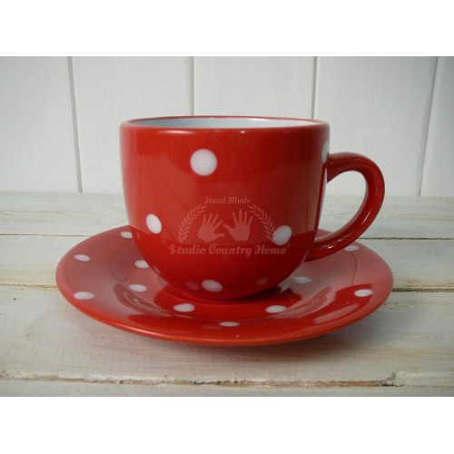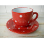 Sada keramickej šálky s podšálkou červenej farby s bielymi bodkami zn. DMD. Šálka má 200 ml a tanierik má pr. 14,5 cm. V ponuke sú aj iné kusy z tejto kolekcie.