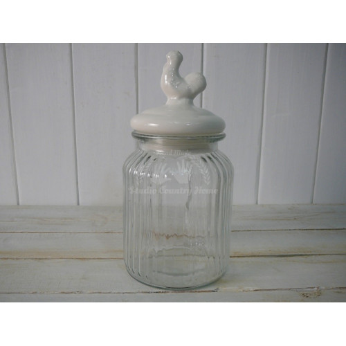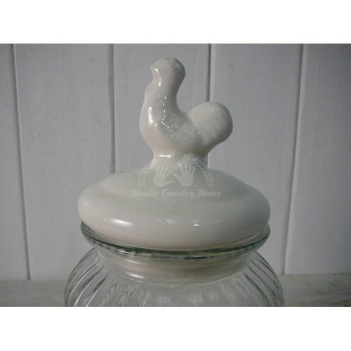 Sklenená nádoba s hermetickým uzáverom. Veko je z keramiky. Veľmi pekným detailom je ozdoba v tvare kohúta. Vhodná na dekoráciu aj praktické využitie napr. na potraviny, kávu, cukor, sypaný čaj, múku, ryžu a pod. Ale využitie nájde aj vo vidieckej kúpeľni, či ako praktický pomocník na skladovanie rôznych drobností. V ponuke sú aj iné druhy a veľkosti.