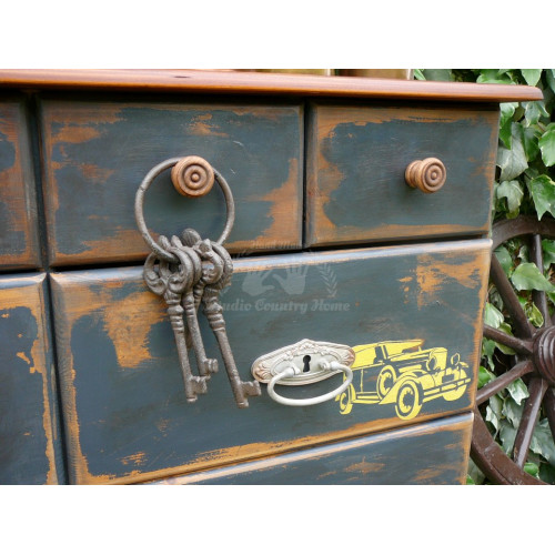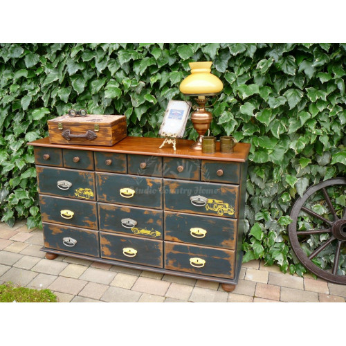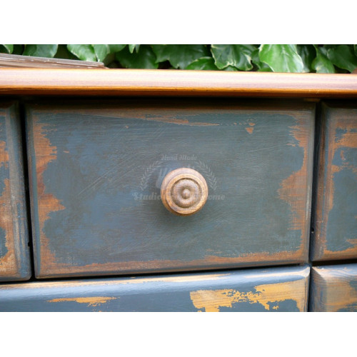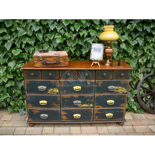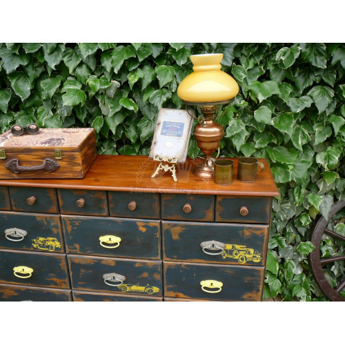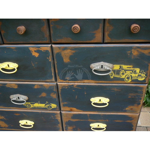Komoda z borovicového dreva upravená v štýle INDUSTRIÁL. Je zaujímavá a zároveň veľmi praktická vďaka mnohým šuflíkom, ktoré sú zdobené veľmi nápadnými úchytkami. Má nové výsuvy na šuflíkoch, aby ich bolo možné úplne vysunúť a tak využiť celkový priestor, ktorý poskytujú.