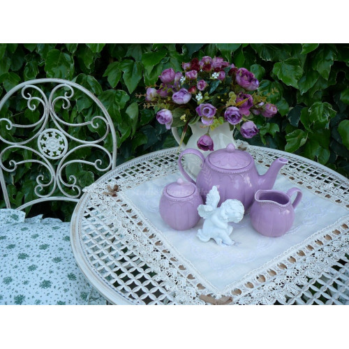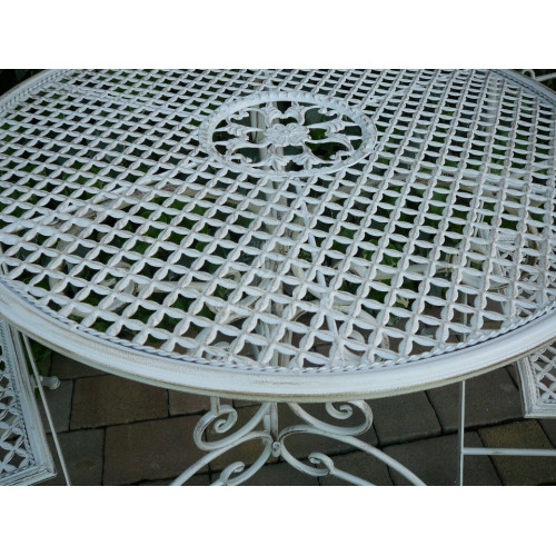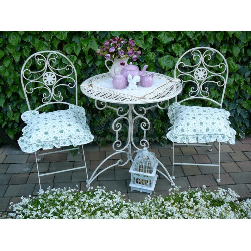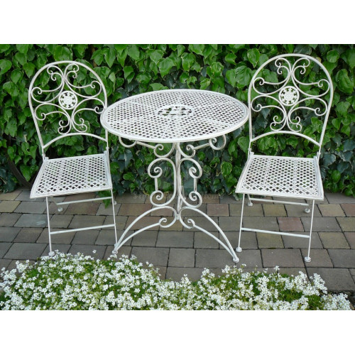 Krásny set záhradného sedenia z kovu smotanovej farby s hnedou patinou zn. CLAYRE EEF. Set obsahuje stôl v. 74 cm a priemer 70 cm a dve skladacie stoličky 40x45x95 cm. Je veľmi pekne vypracovaný. Momentálne je dostupný u dodávateľa. V období od mája do augusta býva často nedostupný. Na základe objednávky je doručenie cca 3 týždne. Jedná sa o veľmi obľúbený kúsok u zákazníkov, pretože krásne doplní Váš balkón, terasu, či záhradu.